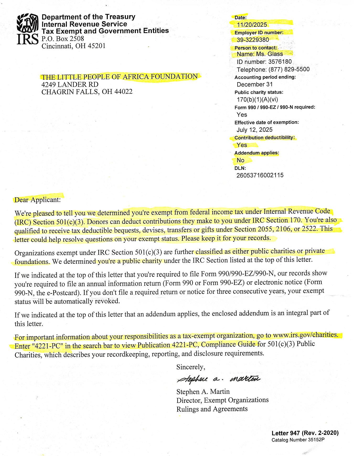 Little People of Africa Foundation is a nonprofit organization registered in the United States. Our 501(c)(3) tax-exempt status is currently pending approval from the IRS.